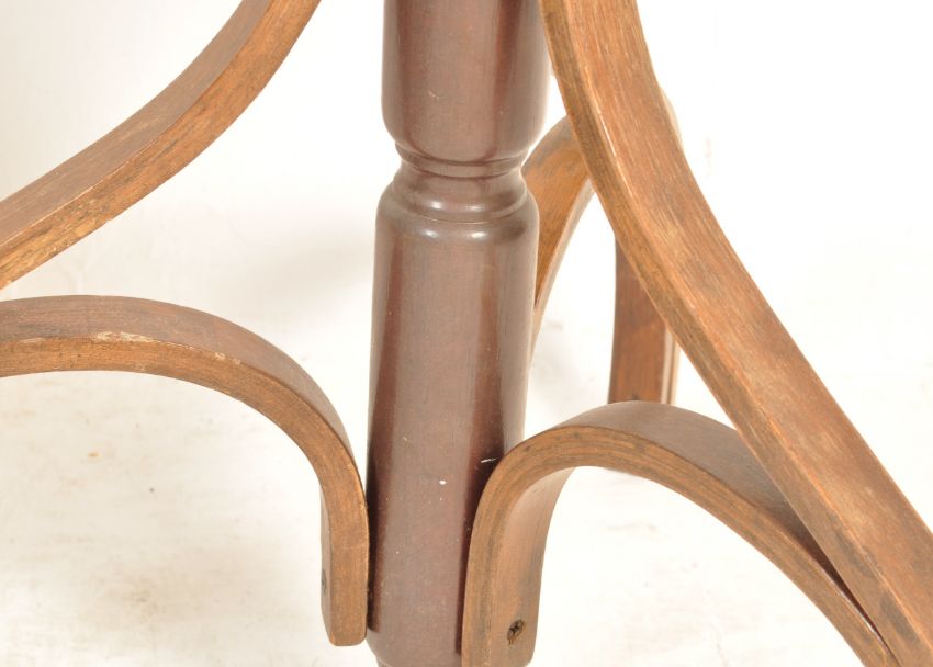 An early 20th century circa 1930’s Thonet style bentwood side table. The table having a circular top with cane / rattan decoration to the top raised on three points bentwood base with turned centre column. No makers marks. Measures 58cm x 48cm.
