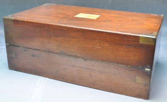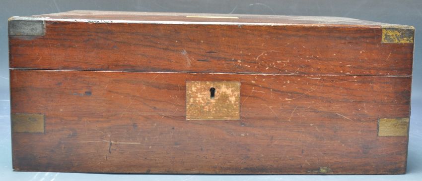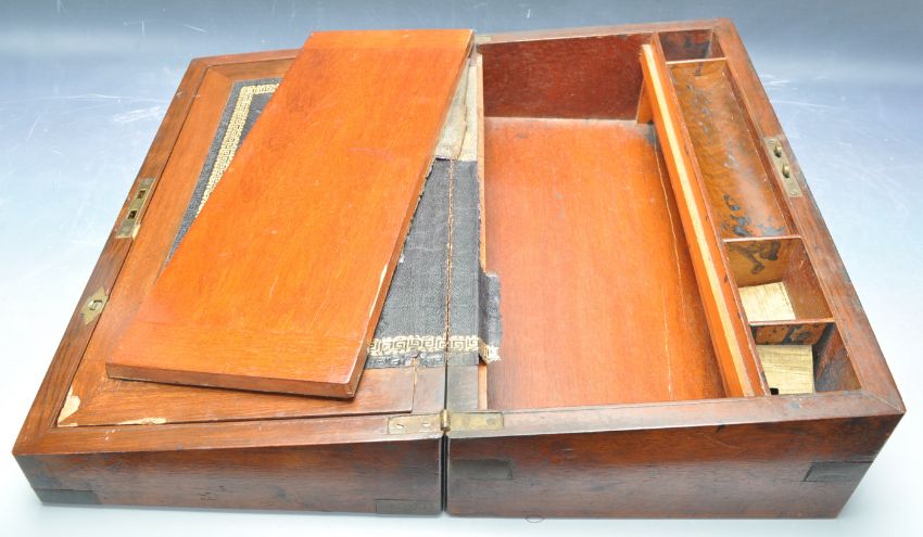 A 19th century George III walnut writing slope having brass corners to the hinged lid openIng to reveal a fully appointed interior. Measures 15cm x 40cm x 23cm