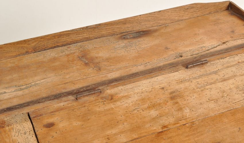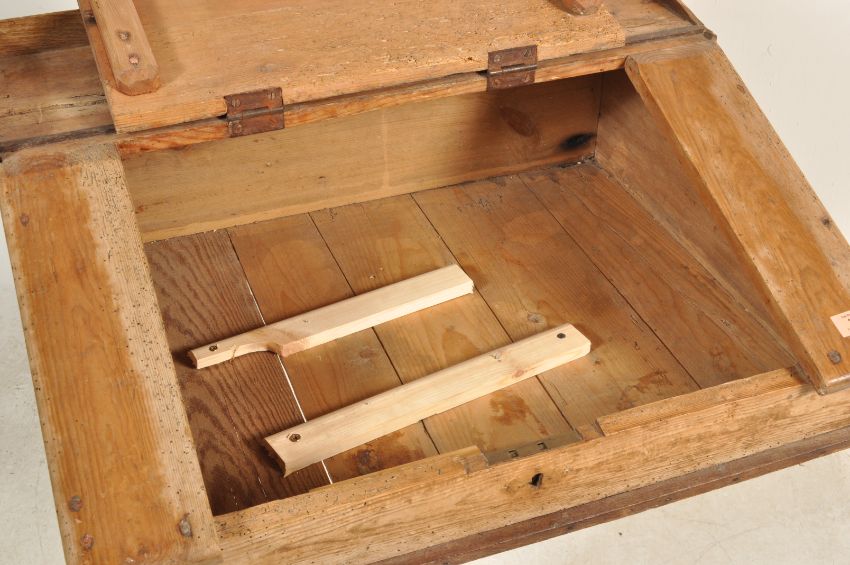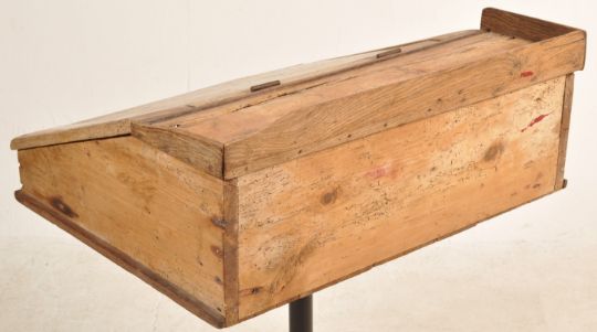 A 19th century Victorian pine flip to school desk of a rectangular top with small gallery back with hinged top raised on later metal trumpet style base. Measures 96cm high x 71cm wide x 56cm depth,