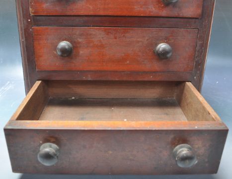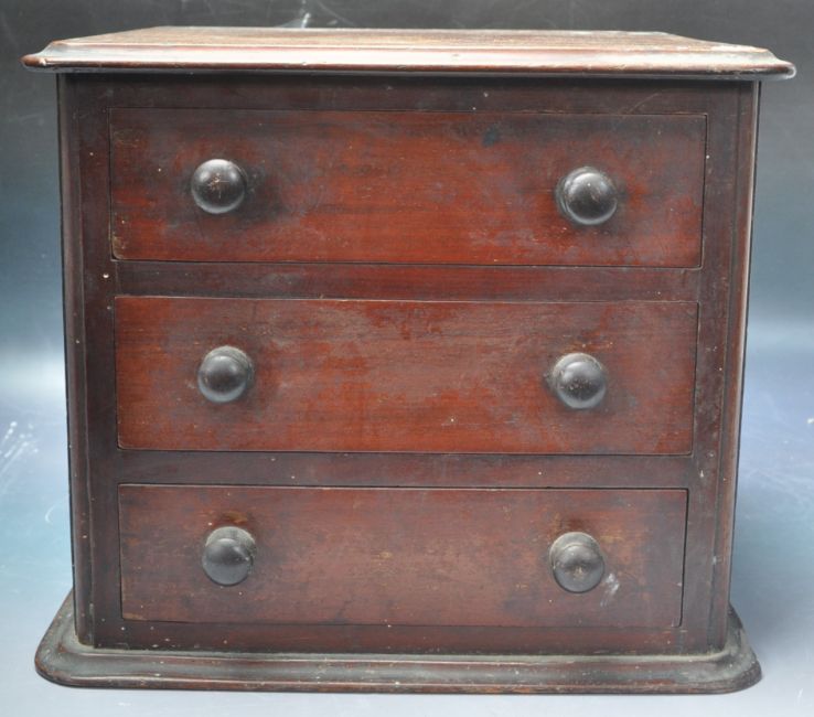 A 19th century Victorian mahogany desk top cabinet / mini chest of drawers. The cabinet of a pedestal form having a rectangular top with shaped margins over three drawers with turned pull handles raised on a plinth base. Measures: 25cm tall x 30cm wide x 23cm deep.