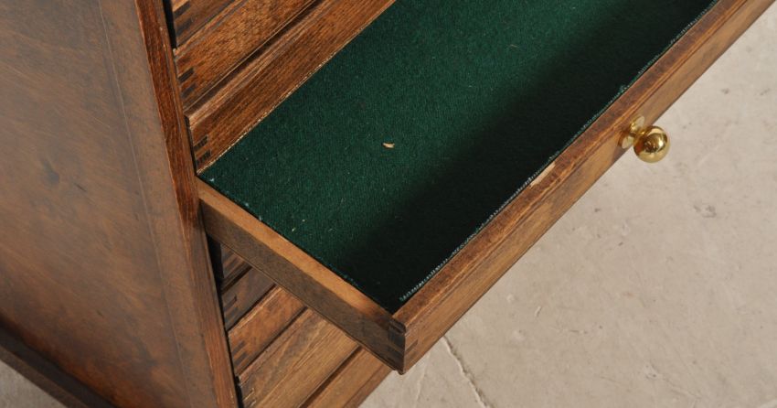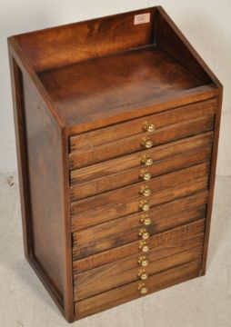 A 20th century vintage Victorian revival beech wood specimen cabinet having a bank of twelve tray drawers. Measures 59cm x 36cm x 27cm.