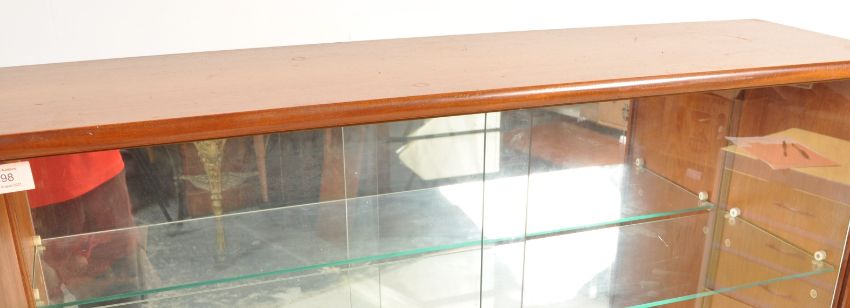 A 1960's Turnidge teak wood mirror back glass display cabinet having twin glazed sliding doors with glass shelves above a long teak wood drawers with recessed handles, all raised on quadrille type legs. Measures 133cm high x 91cm wide x 26cm depth.