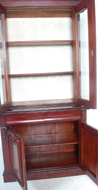 A Victorian style mahogany library bookcase having a frieze top above twin glazed doors with carved detailing to the to of the mirror opening to reveal shelves within raise don a twin door cupboard base with matching applied carvings. 220cm h x 107cm w x 47cm d
