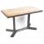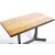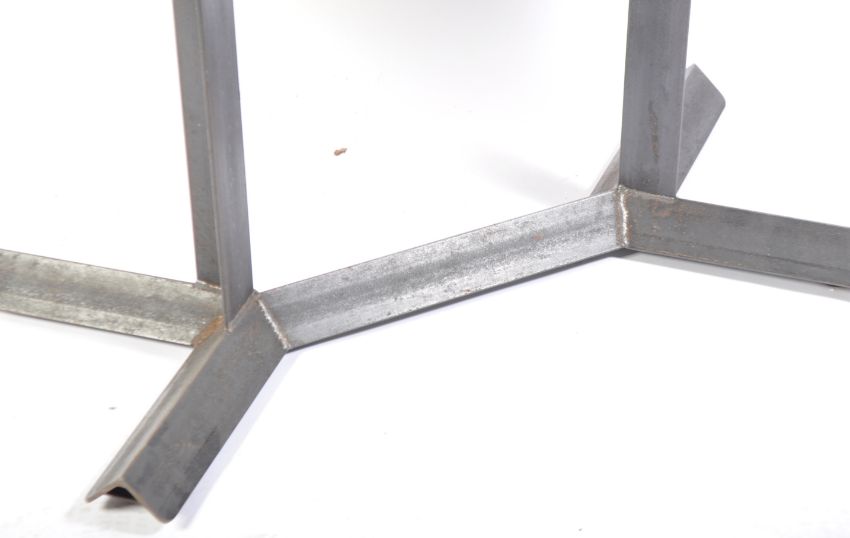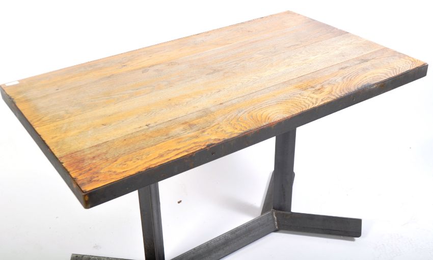A contemporary café / restaurant factory industrial handmade refectory metal steel frame dining table of  rectangular form. The table having rustic wooden panel tops with metal banded to the edges raised on splayed metal legs. Measures approx 75cm x 120cm x 71cm.