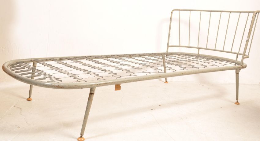 An early 20th Century 1920's French single bed of tubular metal construction having a curved headboard with sprung base with all being raised on tapering splayed supports. All finished in grey.