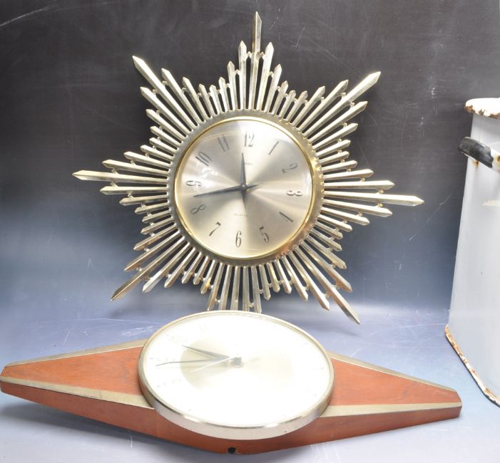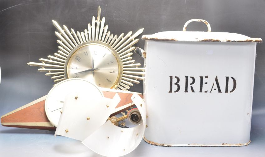 A collection of vintage retro mid 20th century circa 1970s items to include a Metamec clock, a sunburst wall clock, retro white enamel bread bin and a glass topped and iron plant / telephone shelf.