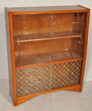 A retro vintage mid 20th circa 1970s teak wood display cabinet having a glazed sliding door raised on bracket feet. Measures, 89 cm H x 74 cm W x 20 cm D.