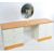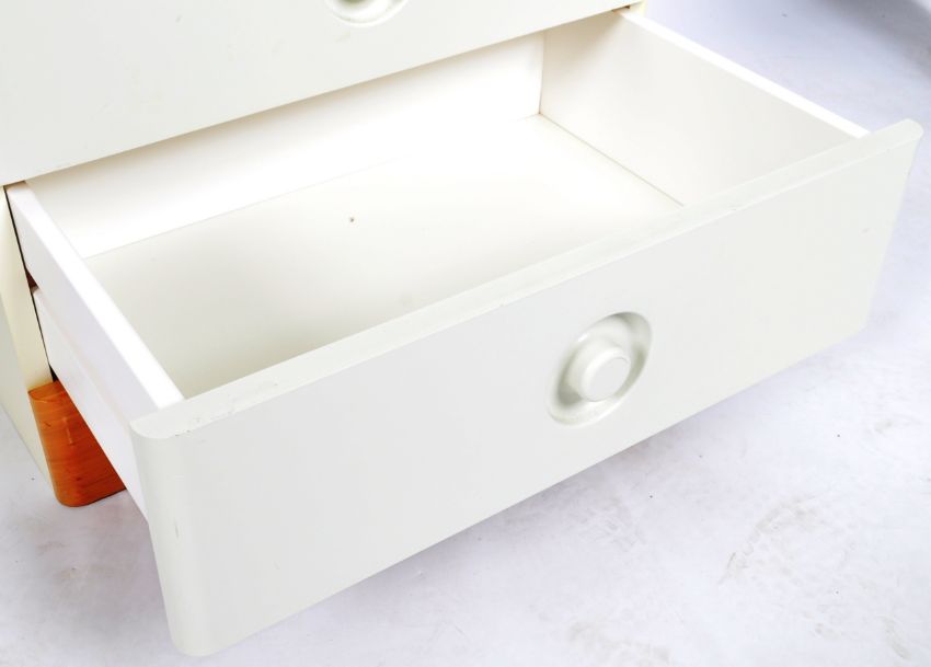 Stag Furniture - A retro vintage 20th Century circa 1980s British design oak topped dressing table chest having a single circular mirror over knee hole recess below. Bank of three drawers to each side having shaped handles with all being raised on plinth bases. Condition; age related wear, overall good. Measures approx; 64cm x 151cm x 43cm.