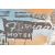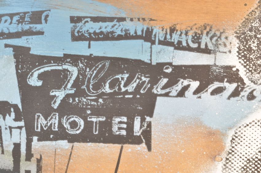 Jim Starr - Untitled - 2011. A contemporary painting in the medium of spray paint and wooden board, . The picture depicting American road and 'motel' signs in black stencil, alongside a pin up depicted in a pop art style. Signed and dated to the back. Measures 79cm x 59cm.
