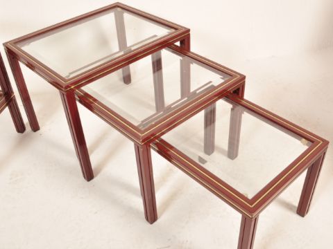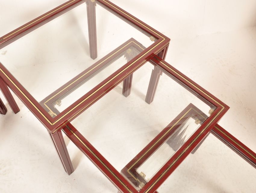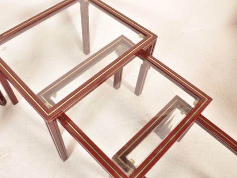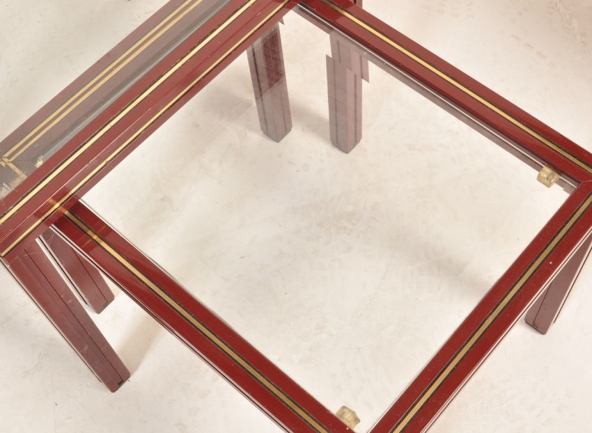 An original vintage retro 20th century circa 1960’s glass nest of tables by Pierre Vandel. The graduate nest of tables of a rectangular form with glass top raised on painted aluminium legs and frame finished in dark red enamel paint with makers mark to the top along with a matching rectangular side table by the same designer.  Measures, 52 cm H x 50 cm W x 48 cm D