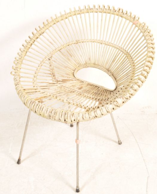 A vintage retro mid century Italian, 1950-1959, Franco Albini rattan scoop chair of a circular form with white painted rattan scoop backrest and seat raised on metal base. Measures 83cm x 80cm x 65cm.