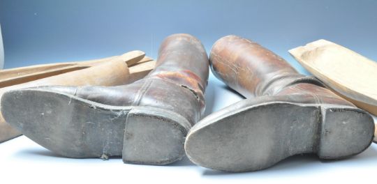 A pair of early 20th century Irish hunting boots by L J Watkins. The brown leather boots of a classical design with pointed toe, high heel and maker to the inside reading L.J. Watkins - hunting boot maker - Dublin. Measures 46cm long.