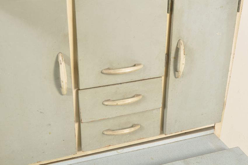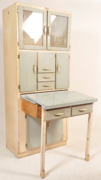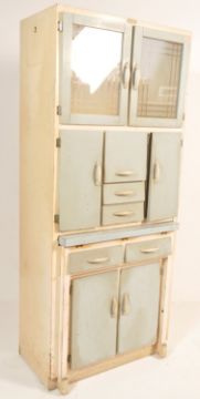 A vintage retro mid 20th century circa 1950’s blue painted kitchen cupboard. The tall kitchen cabinet having twin glazed doors atop over multi compartmented front with pull dining table with drawers to the frieze and cupboard underneath. 181cm high x 78cm wide x 43cm depth.