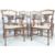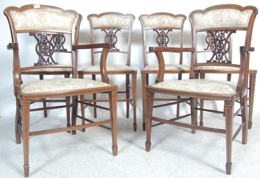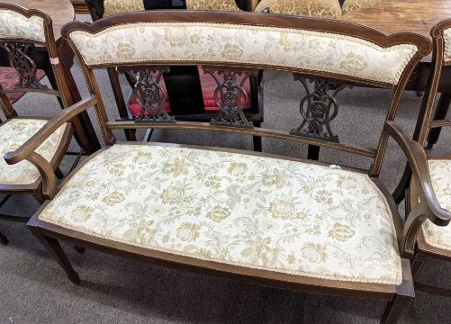 An Edwardian mahogany and inlaid marquetry salon suite comprising of a a two seat salon sofa settee, a pair of carver armchairs and a set of dining chairs. All raised on square tapering legs with overstuffed seats having marquetry inlaid detailing to the back rests. 86cm h x 56cm w x 47cm d