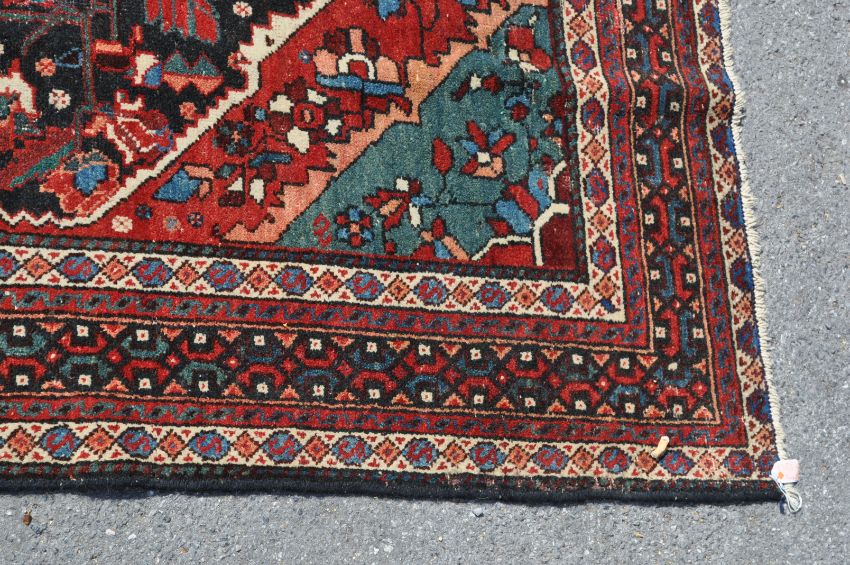 A 20th century Persian Mishan Malayer Rug / carpet rug having a large cream medallion to the centre with blue and red floral motifs set on a dark blue field decorated with red, blue and cream floral motifs, red and blue corners surrounded by multiple geometrical pattern borders, dark blue / black direction pile. Small fringe to each end. Measures 191cm x 172cm.