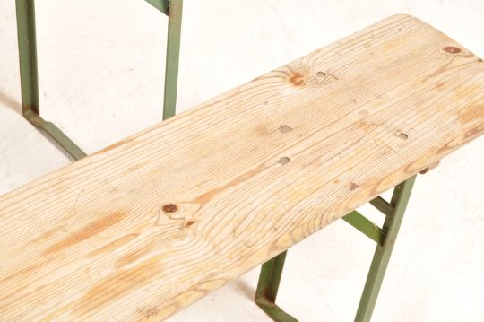 A vintage 20th century circa 1990s folding trestle German picnic beer hall table with pine top and a matching pair of benches. Measures 77cm x 220cm x 50cm.
