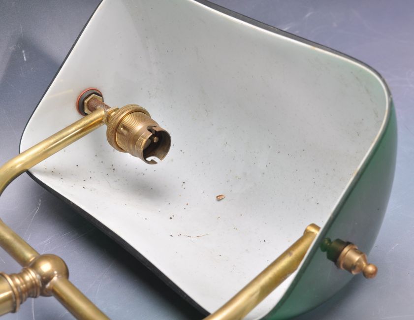 A 20th Century vintage bankers desk / table lamp light of brass construction having an adjustable green glass shade supported by two brass arms united by a single stem column. Raised on a circular stepped base. Measures 36cm tall.
