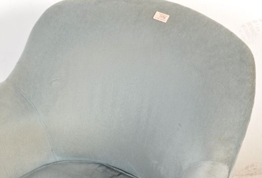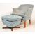 A mid century retro tub armchair and matching  ottoman footstool of angular form. The chair raised on tapering legs, the stool being raised on a four point teak wood base with tapering damask blue button backed upholstered stool atop. Measures 80cm high x 70cm wide x 91cm depth.