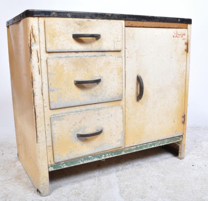 A mid century , circa 1950's Bristyle ( Bristol ) enamel painted metal kitchen dresser cabinet having short drawers over cupboard with white original enamel paint work and logo. Measures 76 cm high x 85 cm wide x 54 cm deep.