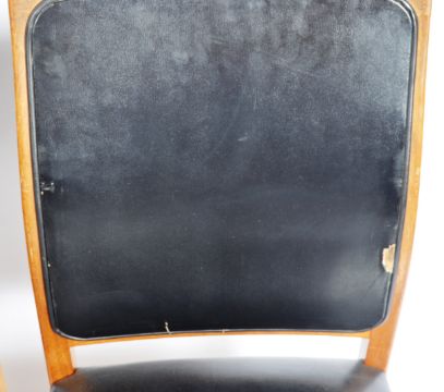 Tom Lupton & John Morton - LM Furniture Ltd of Wallingford - A set of six retro vintage mid 20th Century teak framed and leather dining chairs. The chairs consisting of four dining and two carver armchairs each with teak frames and padded black leather back and seat rests. Each raised on tapering supports united by H-stretchers. Condition; age related ware throughout, all structurally sound. Carvers measures approx;  88cm x 53cm x 49cm.