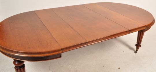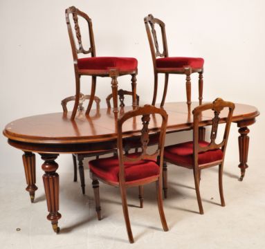 A good Victorian 19th century mahogany extending leaf dining table. The table being raised on fluted mahogany tapering legs with brass cap castors. Together with additional extending leaf and a harlequin set of 6 late Victorian 19th century mahogany dining chairs being raised on turned legs with overstuffed seats under pierced back rests.