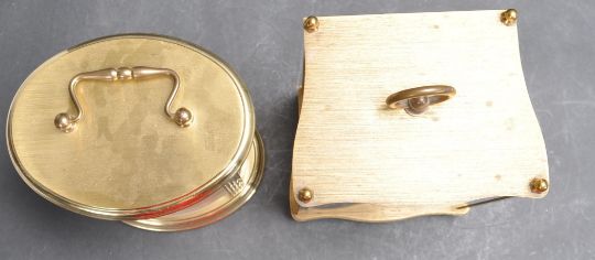 A 20th century 1990s Sewills brass cased carriage clock of oval form with reeded decoration to the sides, exposed movement and stepped plinth base. Together with a Kundo brass and glass carriage clock. Measures 19cm x 14cm x 12cm.