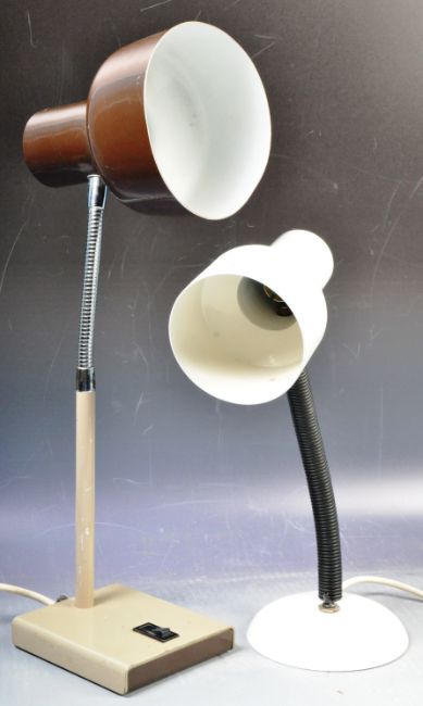 Two retro vintage 20th Century circa 1970s work lamps / desk lights comprising an original Herbert Terry Model 99, gooseneck lamp with enamel shade on domed base along. Both in good condition with some age related wear. Measures approx; 46cm.