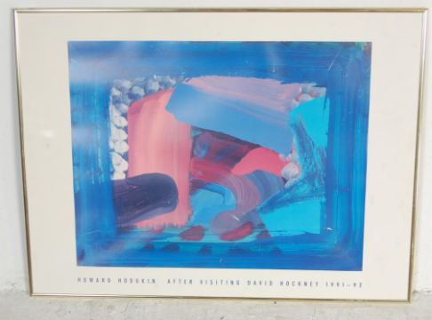 A vintage Howard Hodgkin after visiting David Hockney poster 1991-92 exhibition poster featuring an abstract painting in blue and pink hues. Framed, unglazed.