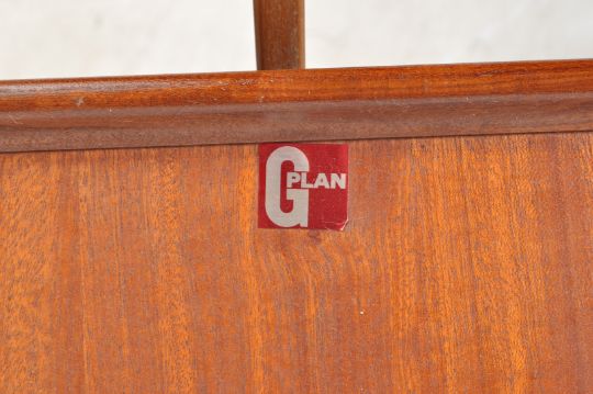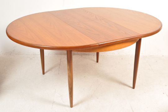 A retro vintage 1970s teak wood extendable dining table and chairs by G plan. The table is of circular form and has a leaf contained within raised on angular tapering legs. The chairs have padded seats and backrest upholstered in green fabric.