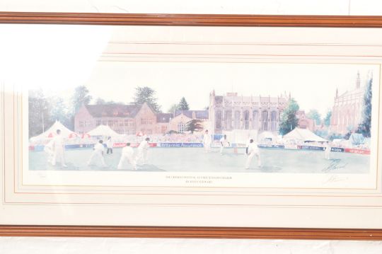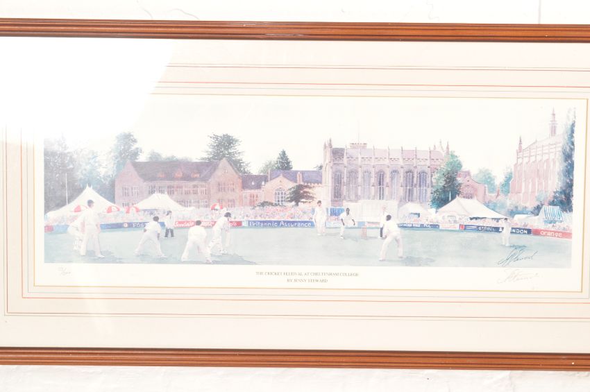 After Jack Russell MBE - Signed polychrome print of Cheltenham Cricket Festival. 141 / 500. Together with a signed print by Jenny Steward of Cheltenham College. Largest measures 65cm x 83cm.