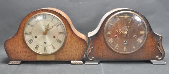 A pair of 1930s Smiths Napoleon mantle clocks to include a walnut clock with carved serpentine wooden details to the case, alongside another oak cased Smiths clock upon bracket feet. With 8 day spring movement. Measures 25cm tall.