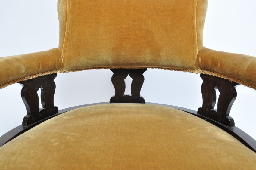 An  Edwardian mahogany salon library chair / tub armchair having a horseshoe shaped back rest over pierced galleried supports over an upholstered seat covered in yellow velvet raised on turned legs. Measures approx. 72cm x 64cm x 57cm.