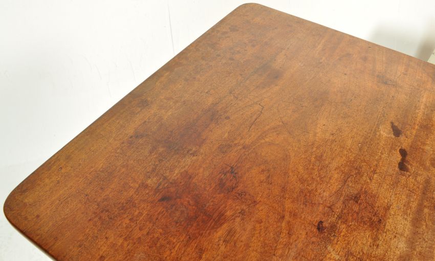 A 18th century George III mahogany tilt top table having a rectangular top with chamfered edges atop a single turned column raised on a tripod base. Measures approx. 68cm x 70cm x 56cm.