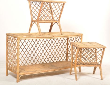 A group of vintage retro 20th century circa 1980s bamboo occasional furniture to include a large rectangular side table along with two matching stools / side tables raised on angular legs.