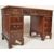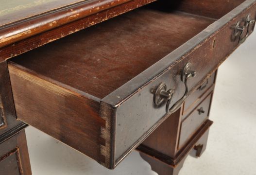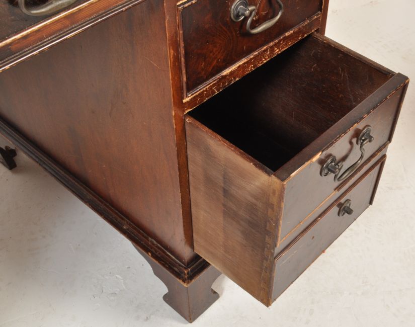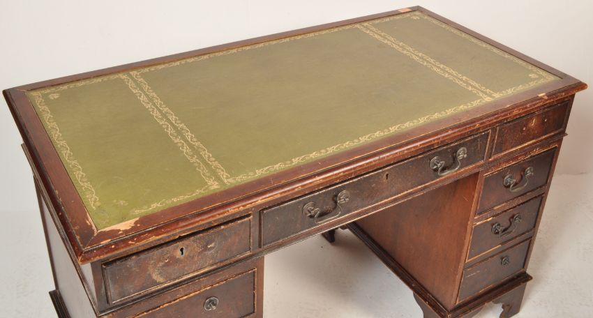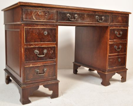 A late 20th century Victorian reproduction mahogany pedestal desk having a green leather skiver top with tooled gilt border at the edges and three drawers upon two pedestal supports with a bay of three drawers upon shaped bracket feet. Measures approx. 78cm x 121cm x 62cm.