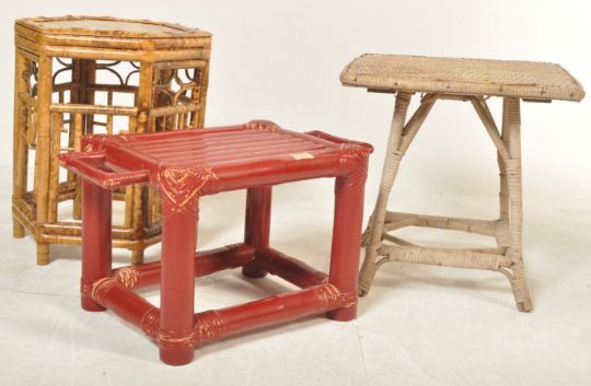 A group of three vintage retro 1950s 20th century Chinese oriental bamboo stools. The collection include a hexagonal shaped stool with geometrical decoration to the base along with a square top stool / side table raised on angular legs along with a red painted stool with side handles. Measures 48cm high x 35cm wide x 35cm depth