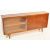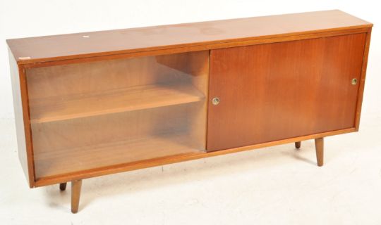 A mid century teak wood, British modern design sideboard credenza / display cabinet. Of wide long form having angled tapering legs with double panel door sliding centre with glass sliding door to the right. Set with shelves within. Measures 69cm high x 153cm wide x 28cm depth.
