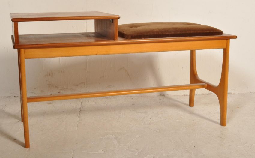 A retro vintage 1970s teak wood telephone table having a cushioned seat to one side with pigeon hole to the other raised on square supports united by stretchers. Measures approx. 54 cm high x 100 cm wide x 40 cm deep.