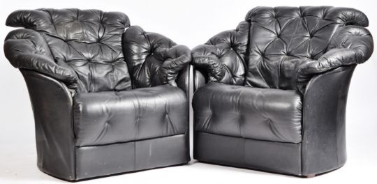 Skippers Furniture - A matching pair of retro vintage mid 20th Century Danish Møbler leather upholster easy lounge / tub armchairs. Each chair having stitched buttoned cushioned seat , arm and backrest. Makers labels present. Condition; both having age related ware to the leather, overall good. Each arm chair measures approx; 80cm x 98cm x 93cm.
