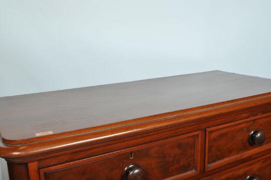 A Victorian 19th century mahogany tall 2 over 4 graduating chest of drawers. The chest being raised on a plinth base with 2 short drawers over 4 deep drawers having knob handles to each. Finished with a flared chest top with rounded corners. Measures 135cm x 120cm x 53cm