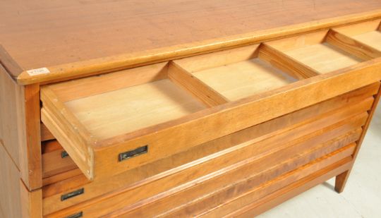 A large vintage retro mid 20th century circa 1950’s artists / architects wooden plan chest having 9 large drawers with underside handles and label holder to the side raised on square legs. Comes in two parts of easy transport and handling. Illegible makers mark to the underside of the drawers. Measures, 92 cm H x 153 cm W x 92 cm D