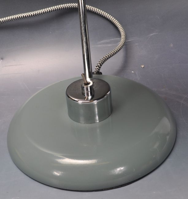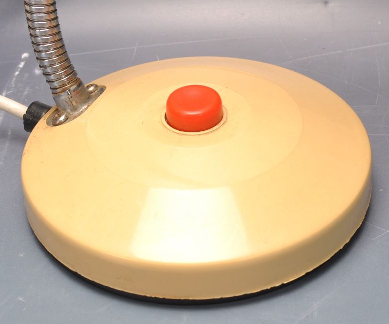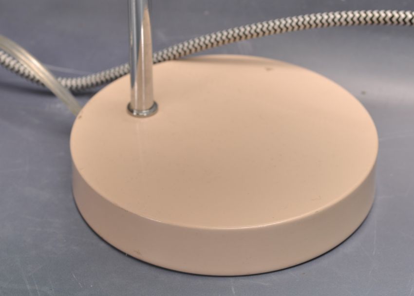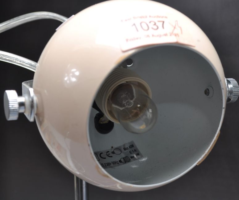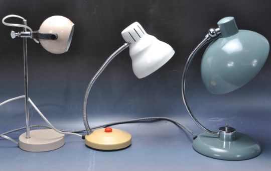 A collection of three retro vintage industrial late 20th century desktop lamps having a white conical lightshade with a fully adjustable support raised on a circular support, a retro style eyeball lamp raised on a circular base together with another. Measures 42cm.