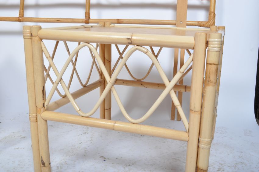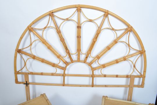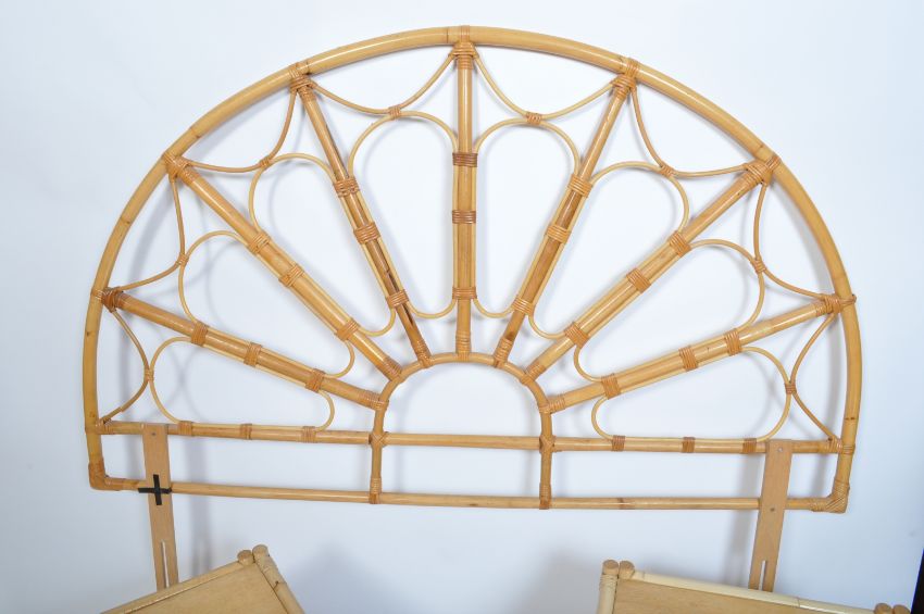 Manner Of Franco Albini - A vintage retro 20th century circa 1970s bamboo bed headboard and side tables. The headboard of a fan shape with arched decoration along with a pair of square bedside table / night stand. Measures approx. 134cm x 152cm x 3cm.