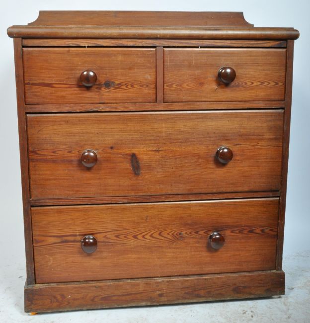 A Victorian 19th century mahogany 2 over 2  cottage chest of drawers. The chest being raised on plinth base with squat bun feet having 2 short over 2 graduating drawers with knob handles. Flared top above with chamfered leading edges and a stub stage gallery back to the rear. 104cm x 93cm x 44cm