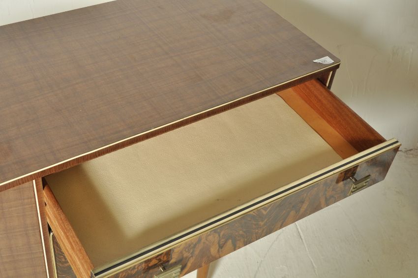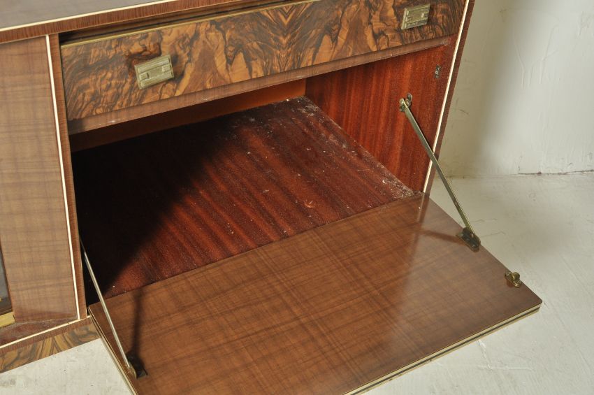 A vintage retro mid 20th century circa 1950’s melamine sideboard credenza. The sideboard having gold / gilt painted / decorated sliding glass doors to the left with cupboard to the right raised on tapered legs. 77cm h x 136cm w x 39cm d
