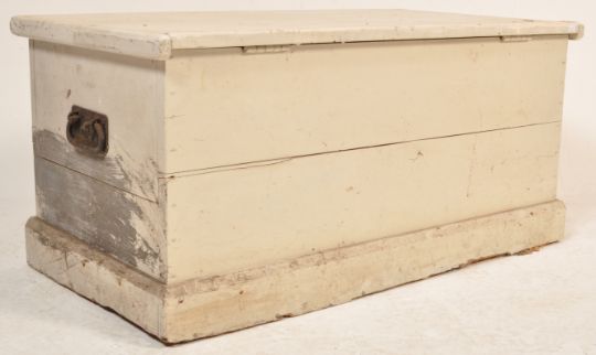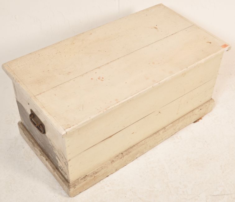 A 19th century late Victorian pine blanket box having a flared top with hinged lid opening to reveal a spacious interior. The blanket box is painted white with carry handles to each side. Measures approx. 45cm x 94cm x 50cm.
