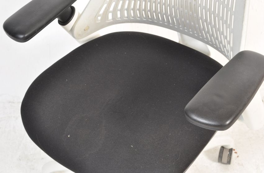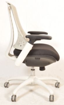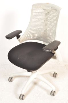 A contemporary Flex Task Operator Chair by dynamic having white frame, black fabric seat with moonstone white backrest raised on a swivel base with castors. Measures, 107 cm H x 68 cm W x 60 cm D
