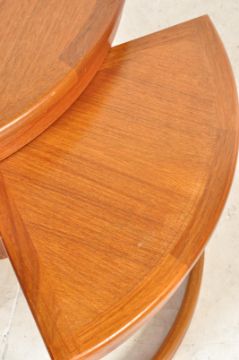 A vintage retro 20th century circa 1970’s demi lune teak wood nest of tables having shaped top above raised on curved legs.