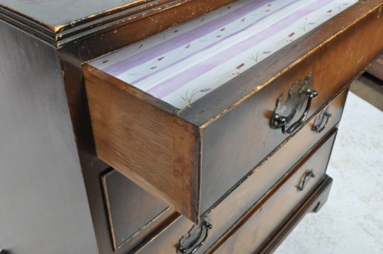A 20th century George II revival walnut chest of drawers. The chest being raised on bracket feet having a bank of 4 drawers with brass swing handles and back plates. Squared edge top above.
