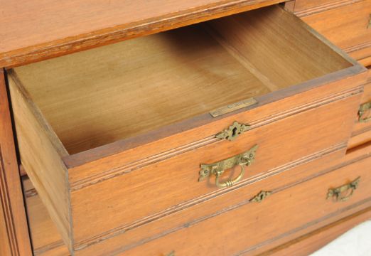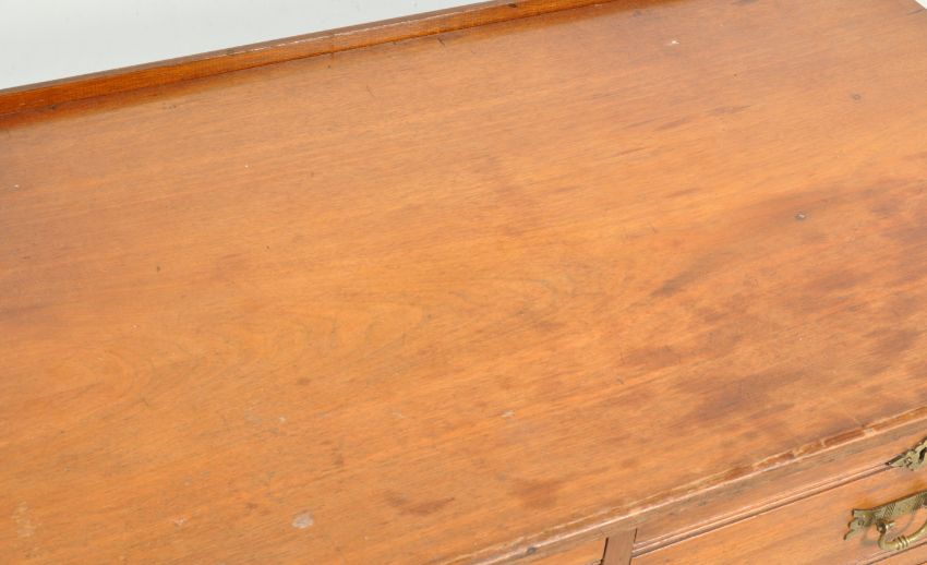 An early 20th century Edwardian walnut Arts and Crafts cottage chest of drawers having two over two drawers configuration with metal swing handles raised on a plinth base. Measures 77cm x 107cm x 53cm